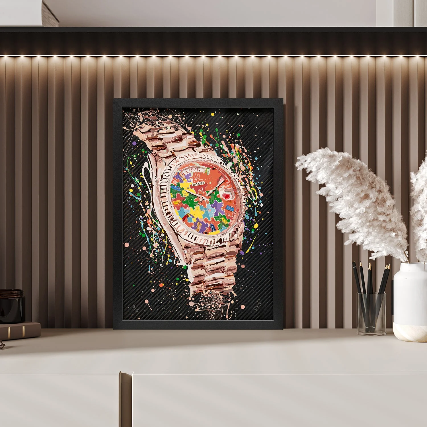A bold interpretation of a legendary design, this hand-painted wall art by Katy Barnfield is produced on carbon fibre with a high-gloss finish and a 3D-like texture. This piece celebrates the colorful and intricate details of the Rolex Day-Date "Puzzle Dial", an icon of modern watchmaking.